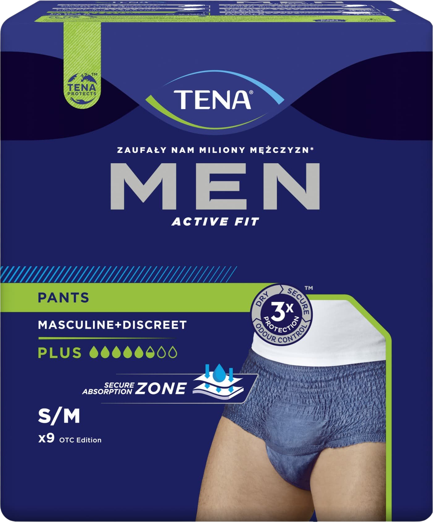 Tmavě modré inkontinenční spodní prádlo TENA Men Pants pro muže se středním až těžkým únikem moči. Vypadá jako spodní prádlo, chrání jako TENA. Více informací
