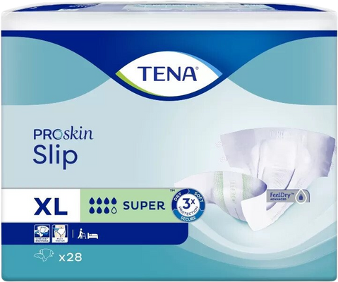 Plenkové kalhotky TENA Slip Super poskytují komfort a ochranu při těžkém úniku moči. Nastavitelné lepicí pásky. Více informací