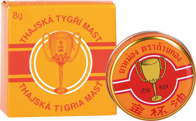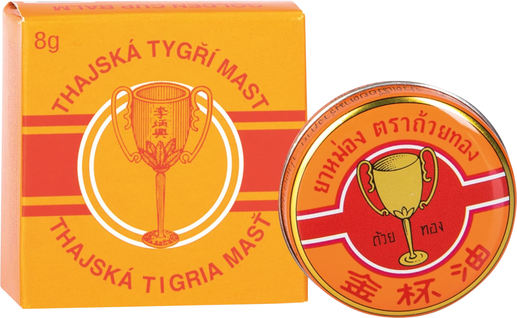 Alfa Vita Thajská tygří mast Golden Cup balm 8 gVše o produktuDoplňující informaceHodnocení produktuThajská tygří mast je vyrobena tradičními postupy pouze z přírodních surovin a její příznivý vliv na zdraví člověka jí zajistili světovou proslulost. Tento výrobek se používá zejména při bolestech hlavy, při svalových potížích a stavech revmatizmu, při bolestech kloubů, zad, nohou, v poúrazových stavech k rekonvalescenci, k aktivaci kožních buněk, k uvolnění napětí způsobené stresem a únavou.