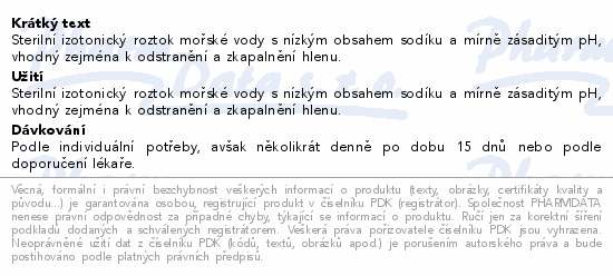 Obsahuje sterilní izotonický roztok mořské vody s 0,9% salinitou a mírně zásaditým pH, který respektuje přirozené prostředí nosní sliznice. Díky nízké koncentraci soli je vhodný pro děti od 3 let i osoby s citlivou nosní sliznicí. Přípravek se používá k odstranění a zkapalnění hlenu při suchosti nosních dutin a při nachlazení. Pomáhá udržovat nosní sliznici hydratovanou a čistou, čímž usnadňuje dýchání a přispívá k prevenci podráždění.