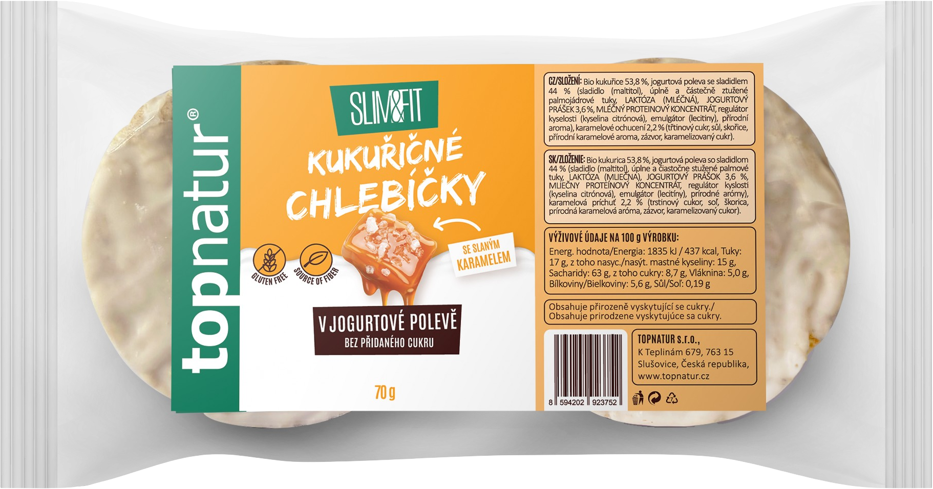 Topnatur Slim&Fit Kukuřičné chlebíčky se slaným karamelem v jogurtové polevě 70 gVše o produktuDoplňující informaceHodnocení produktuSvačina plná vlákniny a dokonale vyvážené chuti! Křupavé kukuřičné chlebíčky s jemnou jogurtovou polevou bez přidaného cukru a špetkou slaného karamelu jsou skvělou volbou, když máte chuť na něco sladkého, ale chcete zůstat v rovnováze.
