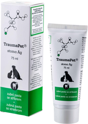 Veterinární přípravek TraumaPet® Ag zubní pasta s obsahem koloidního stříbra NanoComplex® je určená na čištění zubů, odstraňování zubního plaku a jako prevence zánětů ústní dutiny.