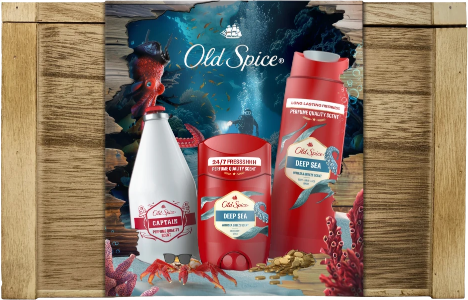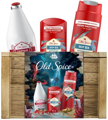Old Spice Treasure Chest pro muže, tuhý deodorant a sprchový gel Deep Sea a voda po holení CaptainVše o produktuDoplňující informaceHodnocení produktuDárková sada Treasure Chest od Old Spice obsahuje tuhý deodorant a mužný sprchový gel Deep Sea plus vodu po holení Captain, to vše zabalené v dřevěné truhlici Old Spice. Toaletní potřeby v sadě Treasure Chest mají vůni Deep Sea, svěží vůni oceánu, a vůni Captain s tóny vody a citrusů, která je naše nejlépe hodnocená vůně*. S touto kombinací nemůžete udělat chybu.