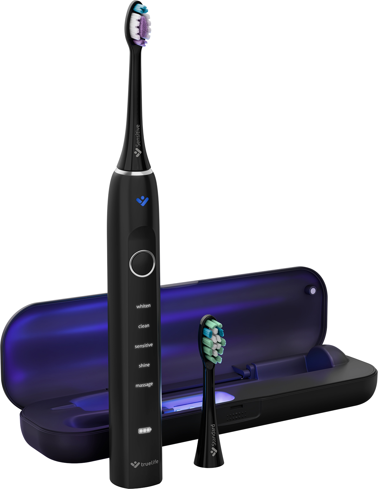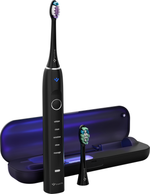 Chytré technologie pro tu nejlepší dentální péči se potkávají v TrueLife SonicBrush Clean70 UV Black. Sonický kartáček, který odstraňuje s výkonem až 90 000 pohybů za minutu až 12× více zubního plaku než manuální kartáček, je skutečným skvostem mezi kartáčky. Sonická technologie SonicTrue® pomocí jemných vibrací čistí plošky zubů a díky víření vody s pastou vytváří mikrobublinky čistící mezizubní prostory. Tlakový senzor s technologií SmartPressure® hlídá, abyste si přílišným tlakem na zuby a dásně nepřivodili zdravotní obtíže. Velkou službu vám prokáže také UV sterilizace ukrytá v dobíjecím pouzdře, která efektivně ničí až 99,9 % bakterií a virů z hlavice kartáčku. Hýčkat své zuby můžete doma i na cestách, a to až 70 dní na jedno nabití, pomocí 5 režimů čištění (Whiten, Clean, Sensitive, Shine, Massage) a 2 přiložených hlavic (Standard a Sensitive). Poslední použitý režim zůstává uchován v paměti a automaticky se spustí po opětovném zapnutí. Běží ideální 2 minuty, na něž je nastavený časovač.