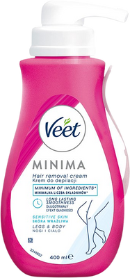 Veet Minima Depilační krém pro citlivou pokožku 400 mlVše o produktuDoplňující informaceHodnocení produktuKrém je velmi šetrný a je určen i pro citlivou pokožku. Na rozdíl od jiných depilátorů krém spolehlivě odstraní i ty nejjemnější chloupky a zajistí vám hladkou pokožku na celý týden.