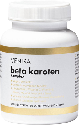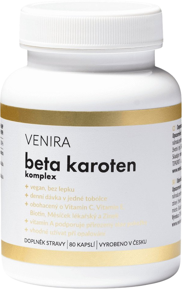 Beta karoten je důležitým zdrojem vitamínu A, který pomáhá udržet přirozený stav pokožky, normální zrak a podporuje správnou funkci imunitního systému. Má antioxidační účinky a zlepšuje toleranci pokožky na sluneční záření. Venira beta karoten navíc obsahuje vitamín C, který chrání buňky před oxidativním stresem a napomáhá k normální činnosti nervové soustavy.