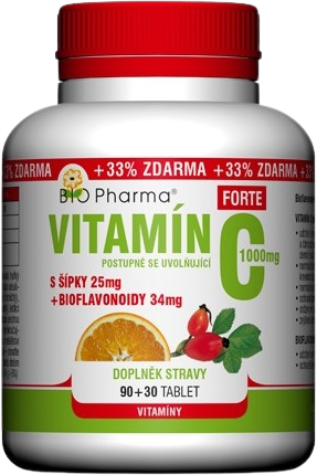Bio Pharma Vitamin C 1000 mg+šípky 25 mg+bioflovonoidy 34 mg 120 tabletVše o produktuDoplňující informaceHodnocení produktuBioflavonoidy zvyšují vstřebatelnost Vitamínu C. Podpora imunitního systému, snížení míry únavy a vyčerpání. Udržení normální funkce cév.