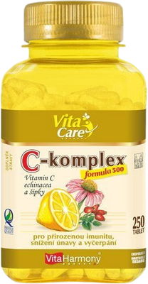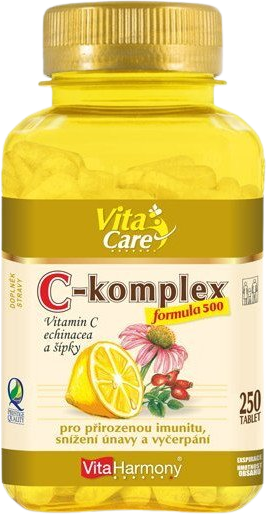 C-komplex formula 500 - Obsahuje jedinečnou kompozici tří účinných látek: vitamin C, echinaceu a bioflavonoidy ze šípků, které se efektivně synergicky podporují. Vitamin C přispívá k normální funkci imunitního systému. Účastní se ochrany buněk před oxidativním stresem, struktur cév, chrupavek, dásní a zubů. Snižuje míru únavy a vyčerpání, přispívá k normální psychické činnosti a činnosti nervové soustavy.