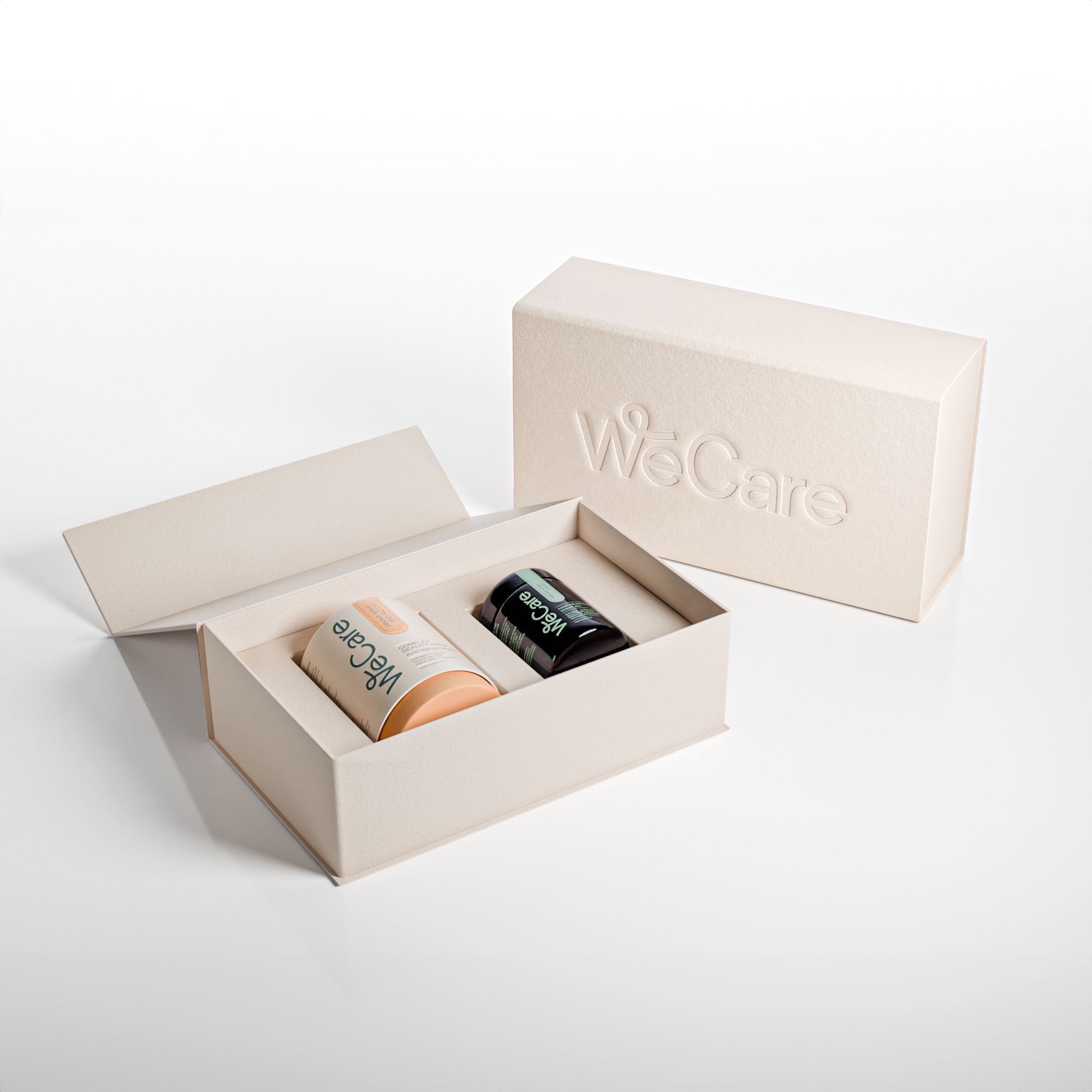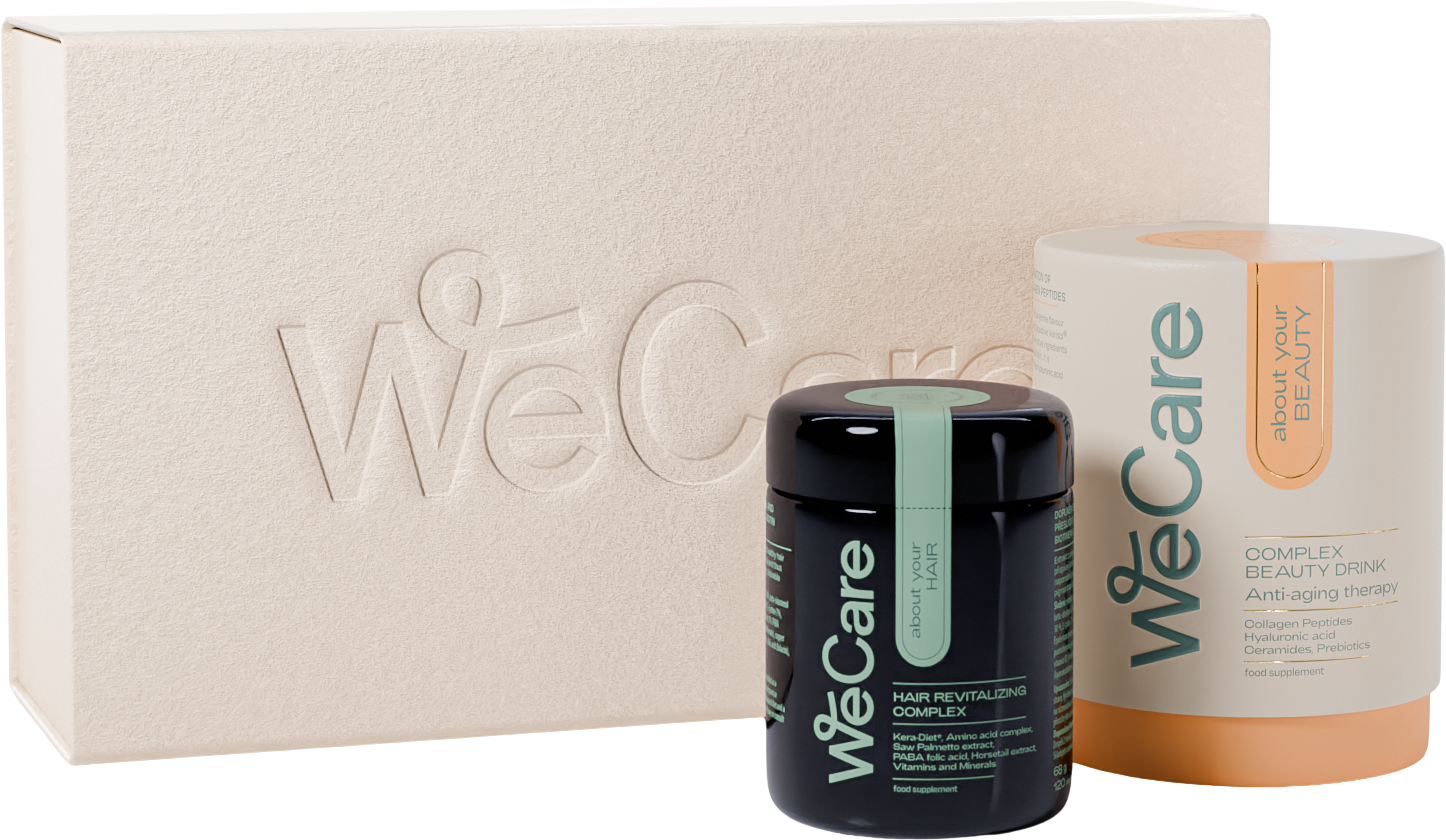 Balíček, který obsahuje dva produkty WeCare: BEAUTY Anti-Aging nápoj s kolagenními peptidy s příchutí mandarinky a HAIR unikátní přípravek pro vnitřní péči o vlasy a vlasovou pokožku. Více informací
