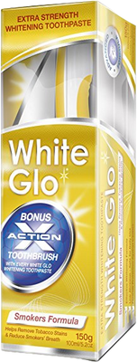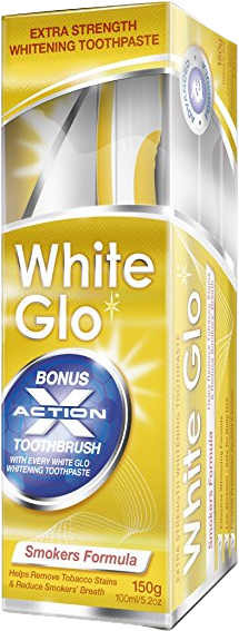 Společnost White Glo vyvinula tento výrobek speciálně určený pro bělení zubů kuřáků. White Glo Smokers Formula obsahuje křemelinu, přírodní produkt, který je velmi účinný při odstraňování skvrn způsobených nikotinem. Odstraňuje chuť a zápach způsobené tabákem. Více informací
