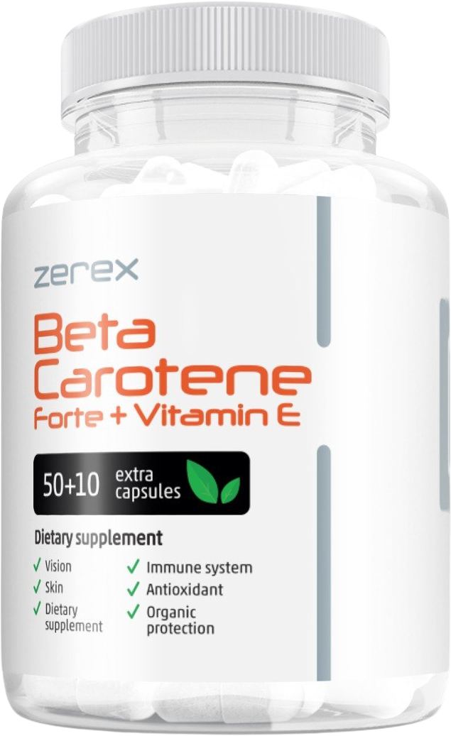 Zerex Betakaroten Forte + Vitamin E - zářivá a mladá pleť 60 kapslíVše o produktuDoplňující informaceHodnocení produktuBetakaroten a vitamín E jsou dva důležité antioxidanty, které mají své vlastní jedinečné vlastnosti.