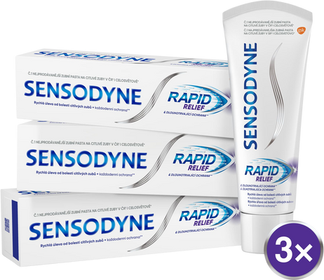 Sensodyne Zubní pasta pro citlivé zuby Rapid 3 x 75 mlVše o produktuDoplňující informaceHodnocení produktuSensodyne Rapid je zubní pasta s fluoridem, která přináší rychlou úlevu od bolesti citlivých zubů** a dlouhotrvající ochranu citlivých zubů*. Poskytuje úlevu od bolesti při citlivosti zubů*.